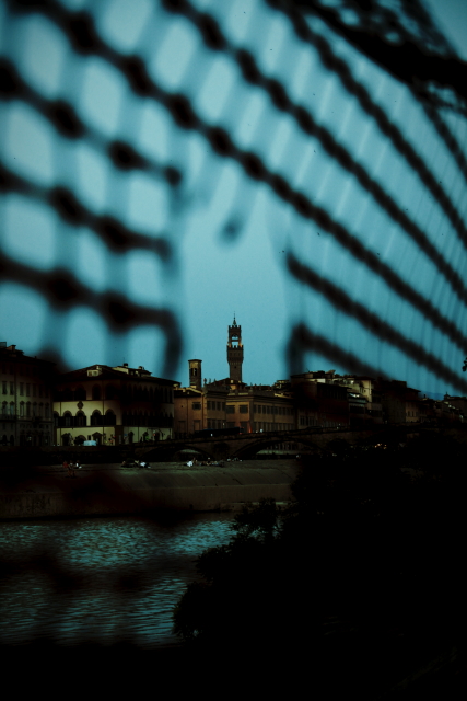 Der Sonnenuntergang war bereits Geschichte und die blaue Stunde spannte sich über den Horizont. Am Ufer des Arno in einem Gardino mit Pasta und Wein sitzend bot sich diese Aussicht auf den Turm des Palazzo Vecchio umrandet von einer schlichten Bauzaunabsperrung. Tutto bene in Florenz.
