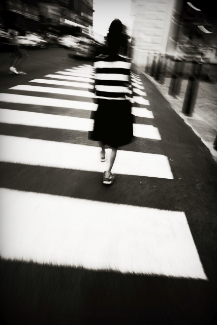 Charakteristische Schwarz / Weiß gestreifte Flächen im Straßenverkehr eignen sich mit ihrem Kontrast, ihrer Dualität perfekt für die B/W Photographie. Durch das Wiederkehren dieses Musters auf dem Kleidungstück ergibt sich ein Muster im Muster. Die beiden Muster verschwimmen durch Bewegungsunschärfe an den Rändern des Kleidungstücks ineinander, verlieren ihre Zugehörigkeit und folgerichtig stellt sich die Frage was ist Mensch, was ist Umwelt.